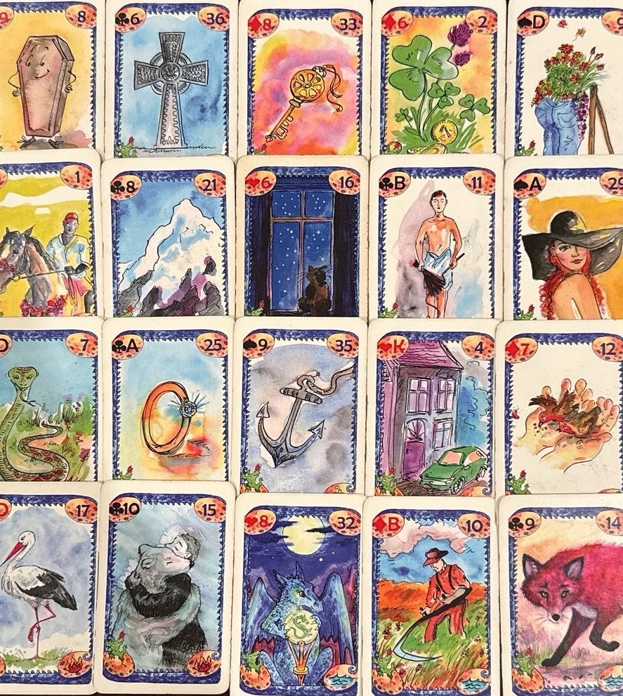 Seit 2019 arbeite ich mit meinen eigenen Drachenenergie-Lenormandkarten. Beim Mischen fliegt eine Karte raus und das ist für mich das Zeichen aus den hohen geistigen Ebenen mit dem Auslegen der Karten zu beginnen. Die Drachenenergien sind für mich allwärtig vorhanden und so arbeite ich auch mit den Karten medial verbunden für sie.
